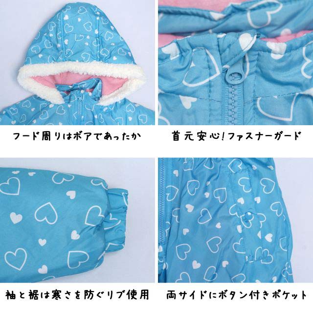 ◇ 商品情報 女児 雪遊びやスキーに大活躍 防寒着つなぎです ファスナーガード付き フード周りはボア フード裏地はあったかフリース フード取り外し不可 袖口リブ 裾はスノーガード付き ウェスト左右にボタン付きサイドポケット サイズ調整機能なし ♪