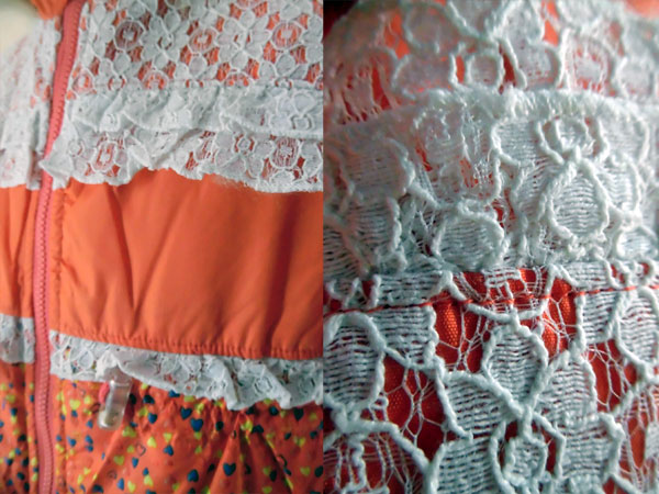 ◇ 素材 表地・裏地・中綿:ポリエステル-100% ファー:ポリエステル-100% レース:綿-100% ◇ 適応サイズ(タグ表記) サイズ/体重 95cm/14kg ◇ 採寸サイズ サイズ/総丈/身幅/袖丈/股下 95cm/約76cm/37cm/33cm/31cm ※ 実寸平置きのサイズとなります。